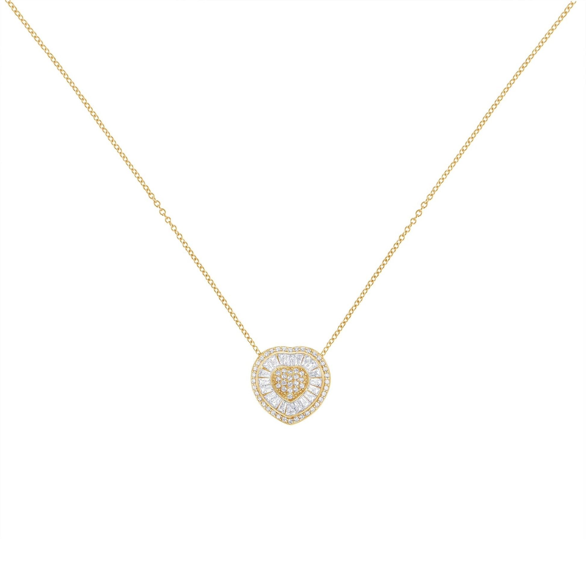 A beautiful gold and diamond heart shaped pendant. This necklace is made with 31 round and 22 baguette-cut diamonds in a prong and channel setting, respectively. The diamonds are set in a lustrous 10k yellow gold, and the pendant comes with a box chain.